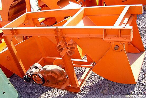 擺式給料機(jī)的三角帶減速器迫使電動(dòng)機(jī)減速,經(jīng)減速的動(dòng)力傳遞到可調(diào)偏心距的偏心輪。再由偏心輪通過驅(qū)使擺動(dòng)底板,連桿作往復(fù)擺動(dòng),礦倉里的礦石再經(jīng)過給料機(jī)體內(nèi)腔,一次次勻速的由排料口排出機(jī)外,確保給球磨機(jī)均勻的喂料。